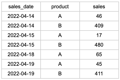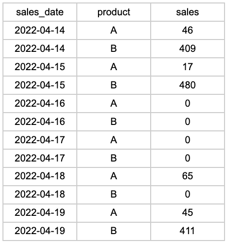 16일과 17일에는 판매가 발생하지 않았으므로 행이 완전히 누락되었습니다. 평균 일일 매출 을 계산 하거나 시계열 예측 모델을 구축하려는 경우 이 형식이 큰 문제가 될 것입니다. 우리가 해야 할 일은 누락된 날짜에 대한 행을 삽입하는 것입니다.