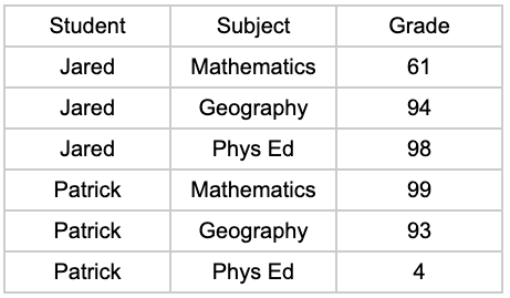 FROM ( SELECT Student, Grade, Subject FROM skool)